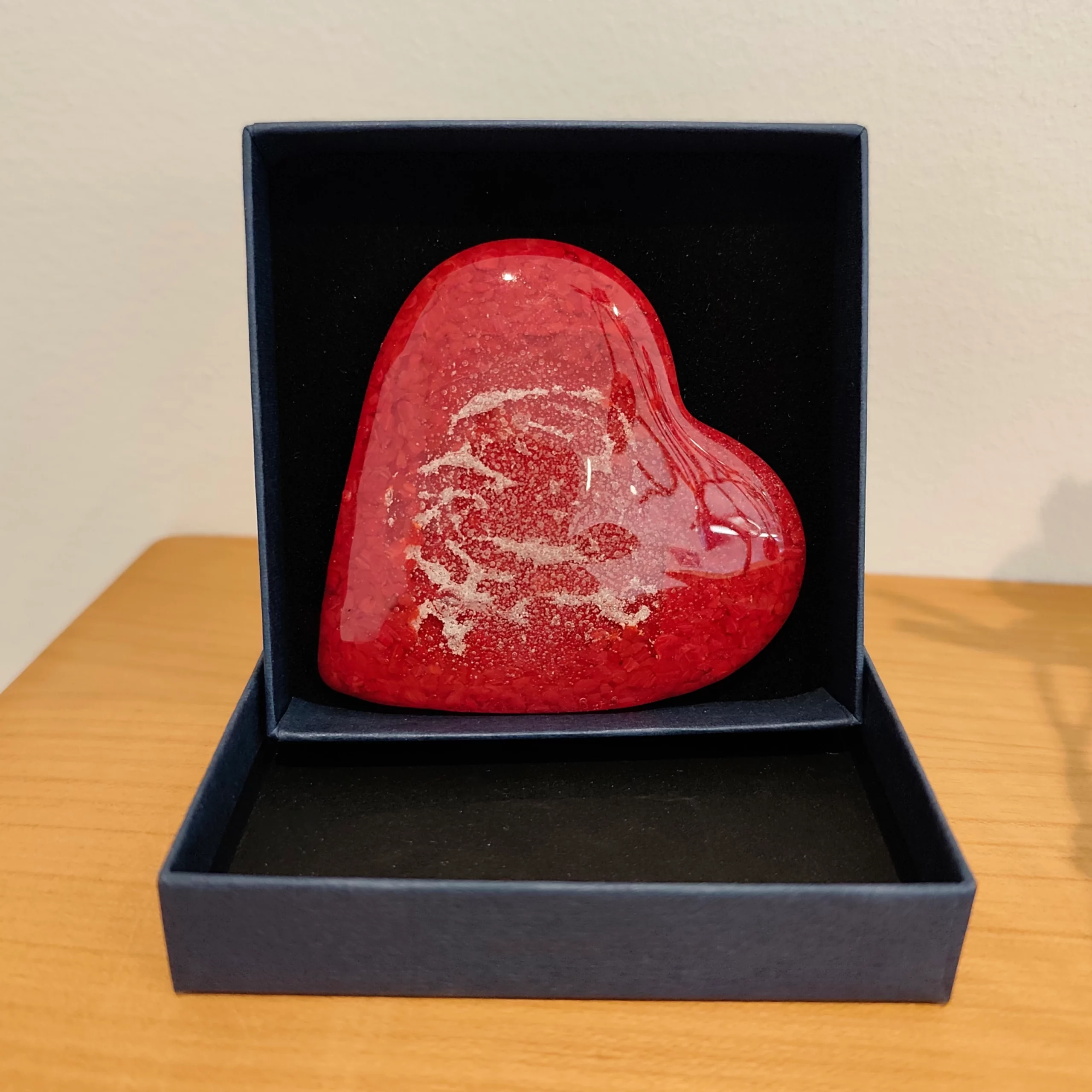 This keepsake containing your loved one’s ashes is cast in glass. The Swiss artist lovingly handcrafts each heart. We require 2 grams of ashes and approximately 3-4 weeks for its creation.