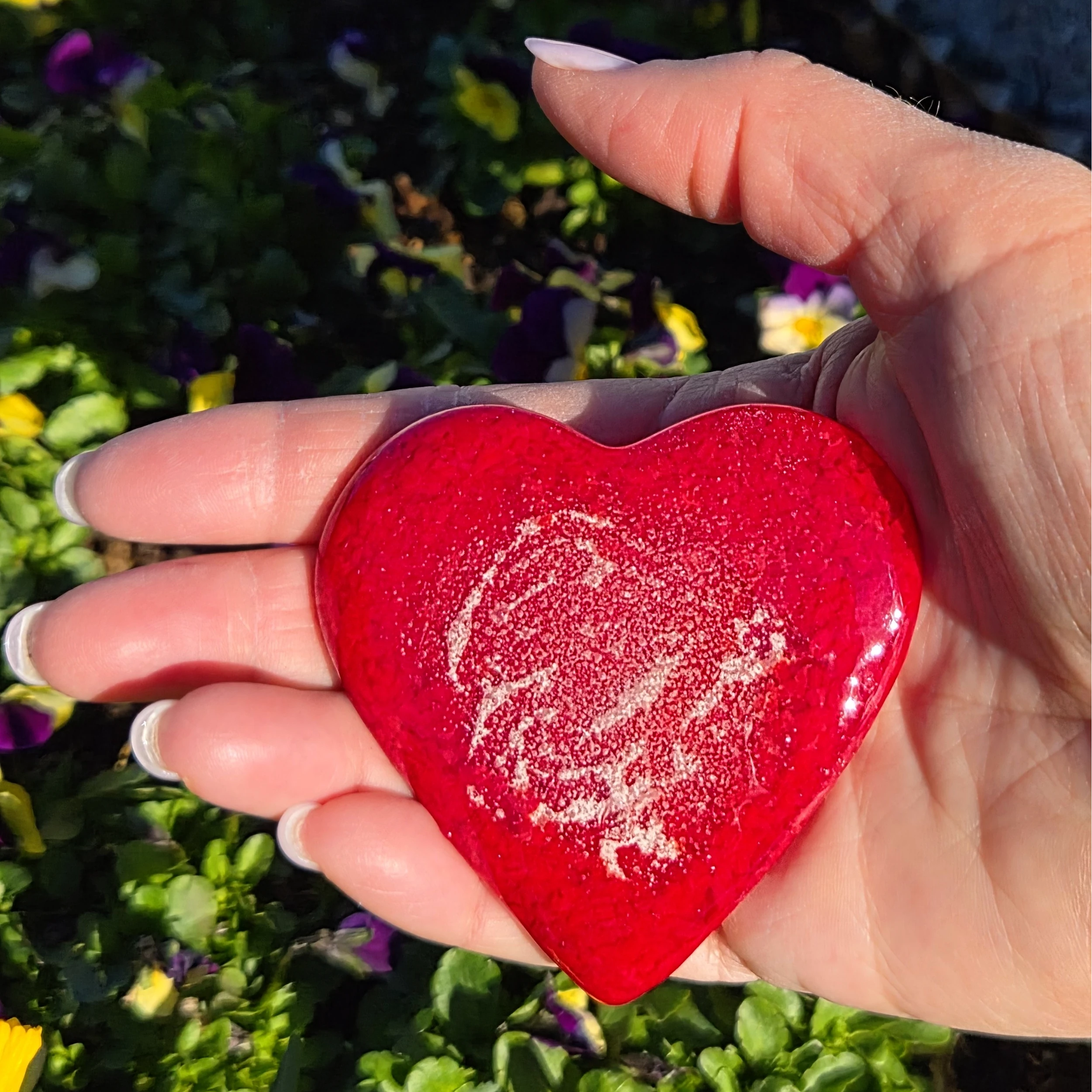 Un cœur avec quelques grammes de cendre. Il est fabriqué en verre et fait main par une artiste suisse. Nous avons besoin de 2 grammes de cendre et la fabrication dure environ 3-4 semaines.